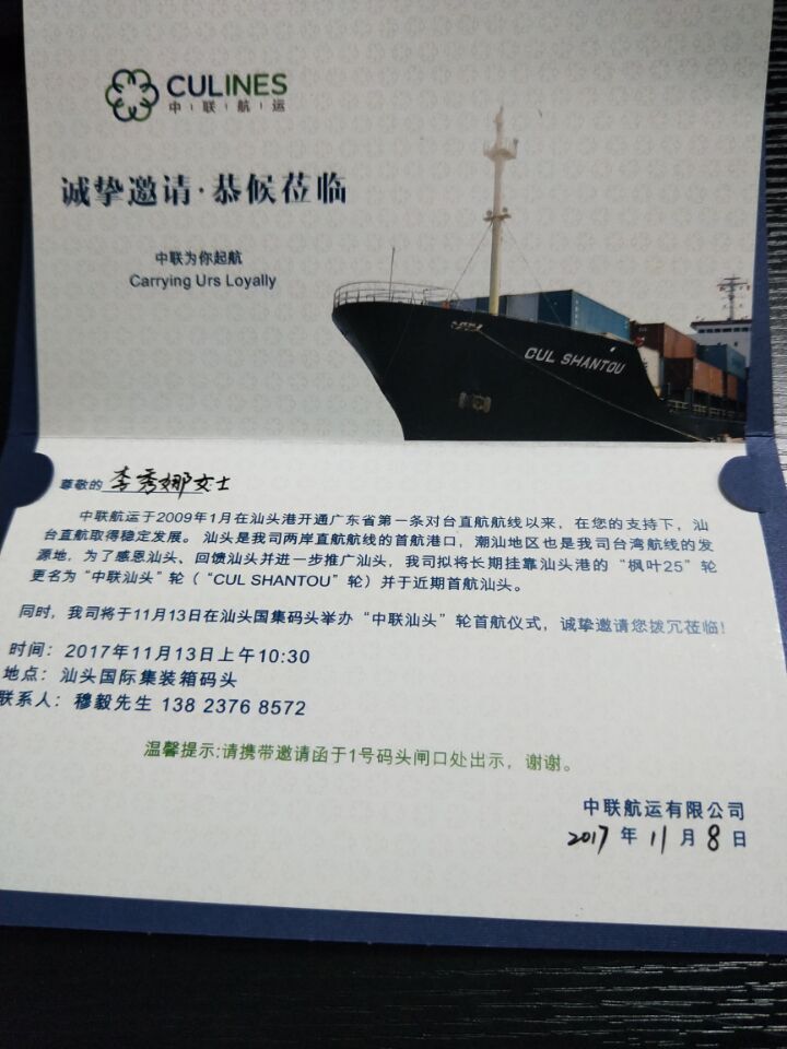 汕頭誼通國際貨運(yùn)代理有限公司李秀娜總經(jīng)理獲邀嘉賓,出席此次活動(dòng),觀摩了”CUL SHANTOU”的首航.