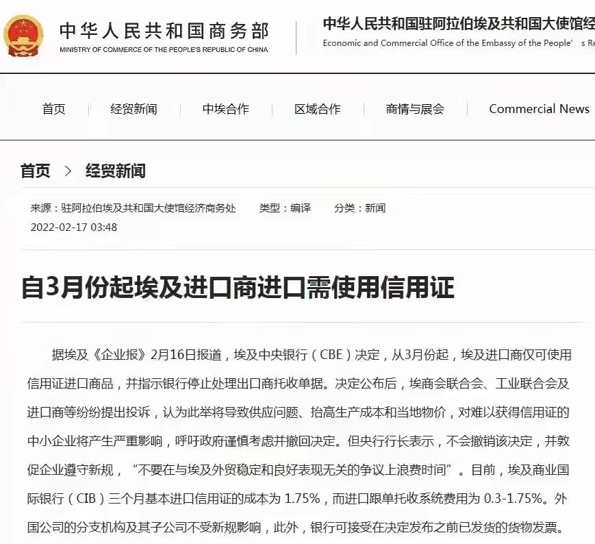 注意:自3月份起埃及進(jìn)口商進(jìn)口需使用信用證